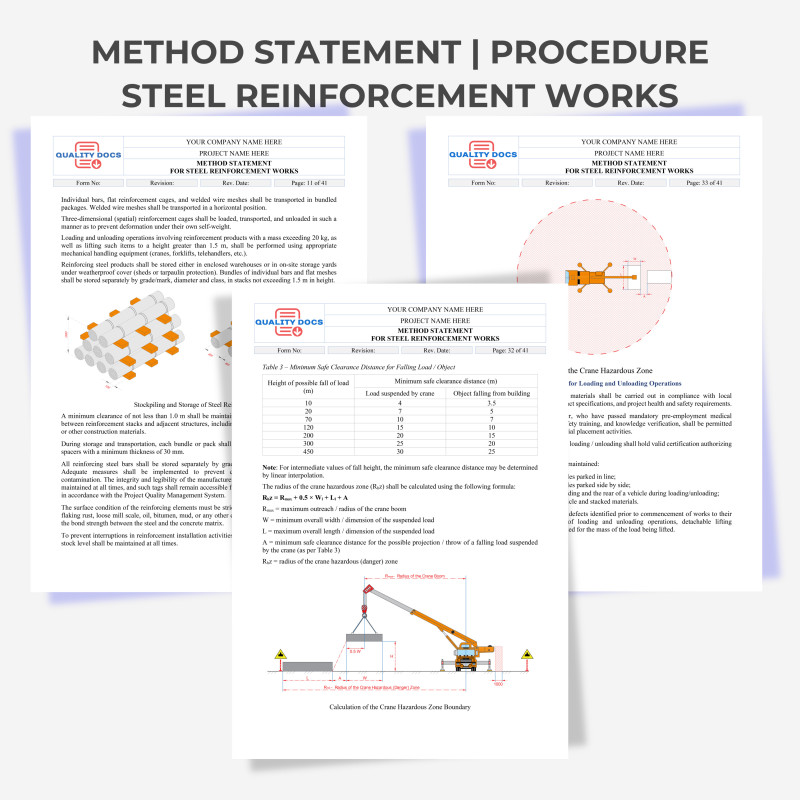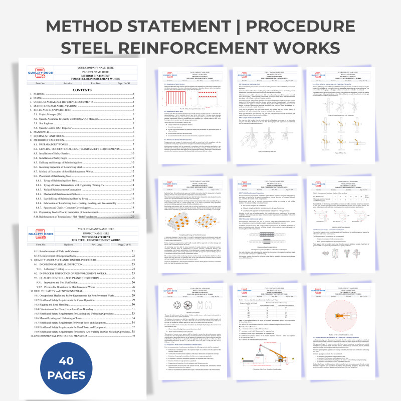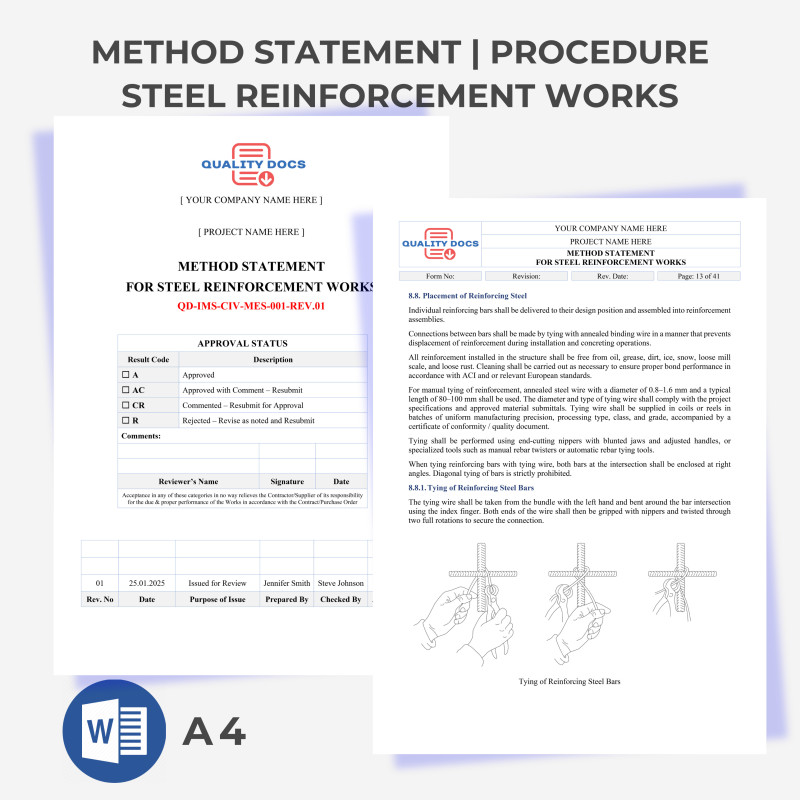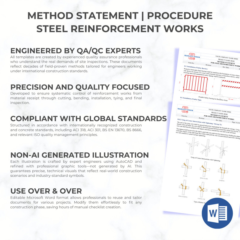 This ready-to-use Method Statement for Steel Reinforcement Works provides a detailed, compliant guide for executing rebar installation, tying, splicing, and placement in reinforced concrete structures. It ensures full adherence to international standards like BS 8666, ACI, and ISO requirements while covering delivery, storage, fabrication, and quality inspections. Ideal for foundations, columns, walls, and slabs, this template streamlines safe, high-quality reinforcement activities on construction sites.